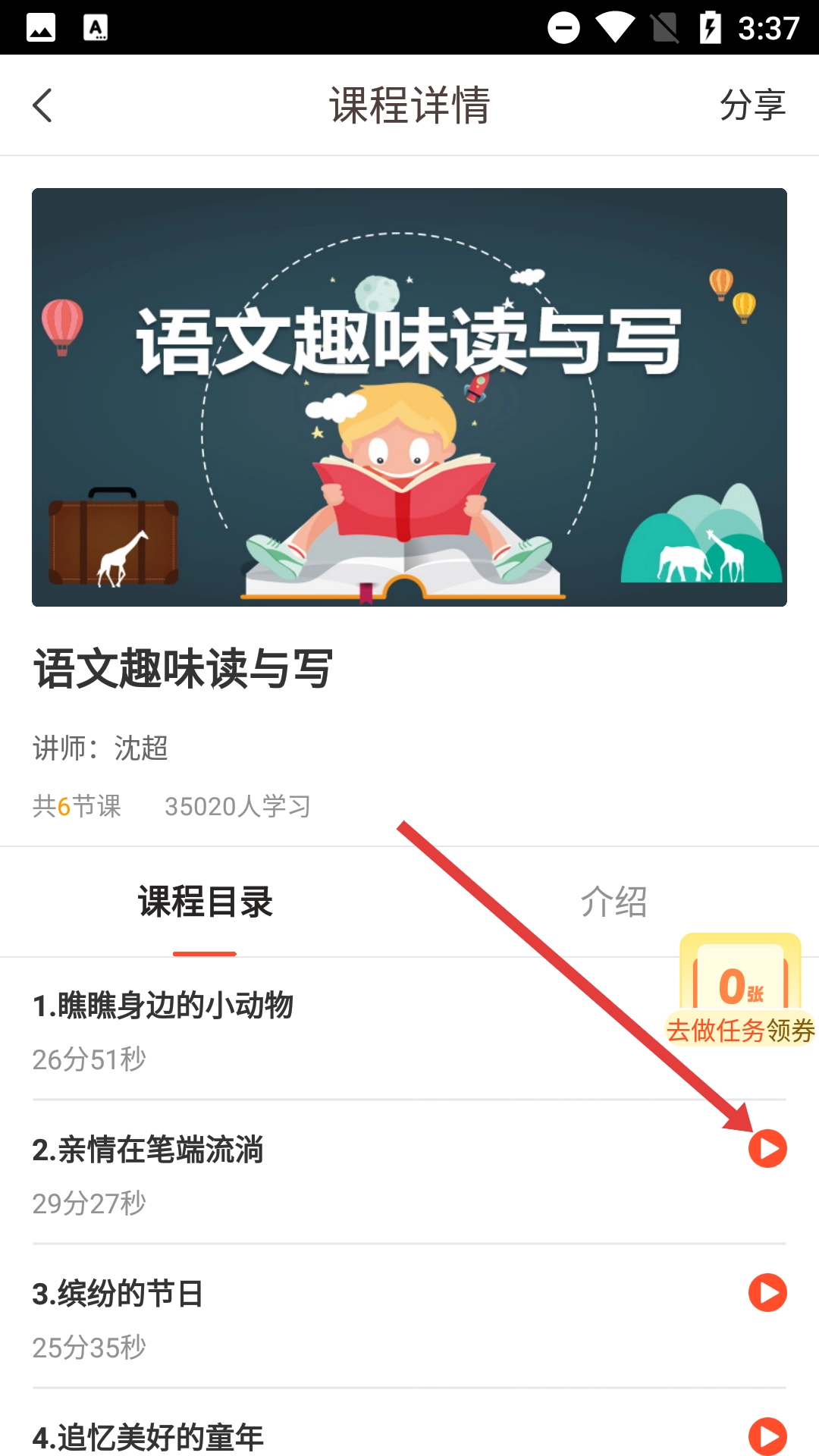 4、在课程详情页面,点击课程目录中具体课时右侧的播放按钮,如【亲情在笔端流淌】,开始学习该课时内容。