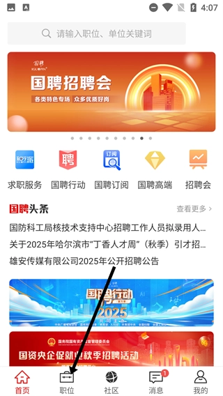 1、在国聘首页,点击底部【职位】,进入职位列表页。