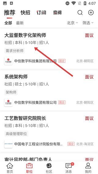 2、在职位列表页,选择感兴趣的职位如【大监督数字化架构师】,点击进入职位详情页。