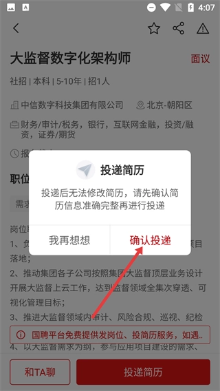 4、在提示框中点击【确认投递】,即可完成简历投递操作。