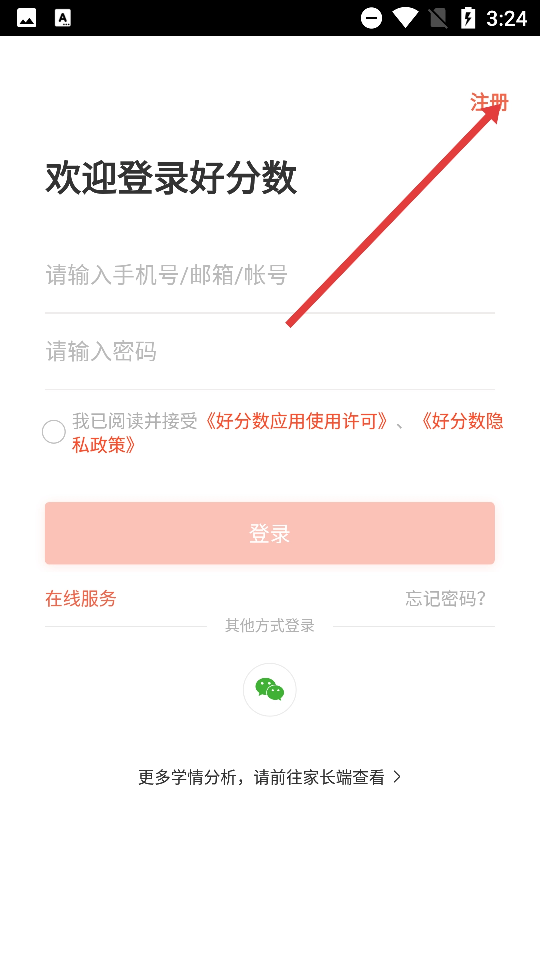 在好分数App弹出的温馨提示窗口里,点击【同意】按钮,以此确认同意《好分数应用使用许可》与《好分数隐私政策》的相关内容。