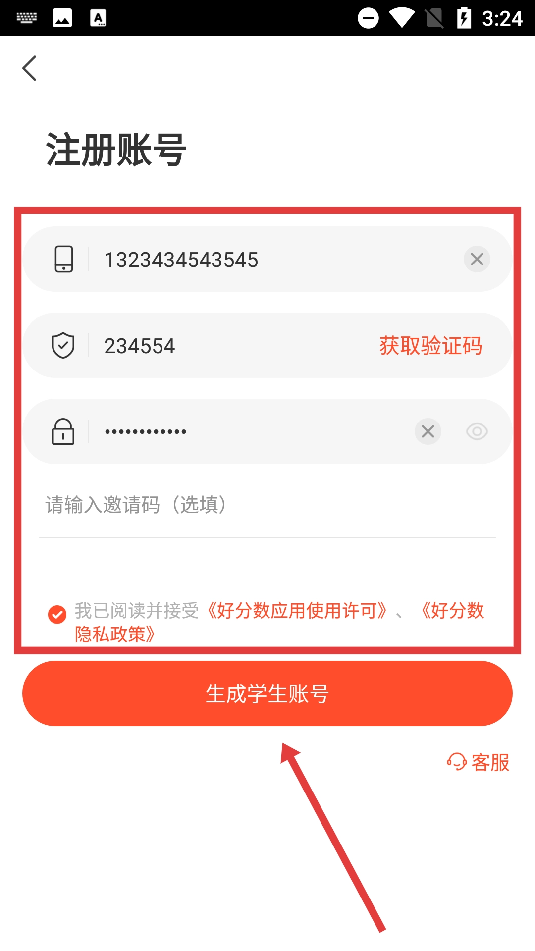 4、进入注册账号页面后,依次填写手机号、验证码与密码,勾选同意相关条款,随后点击【生成学生账号】按钮,即可完成账号注册操作。