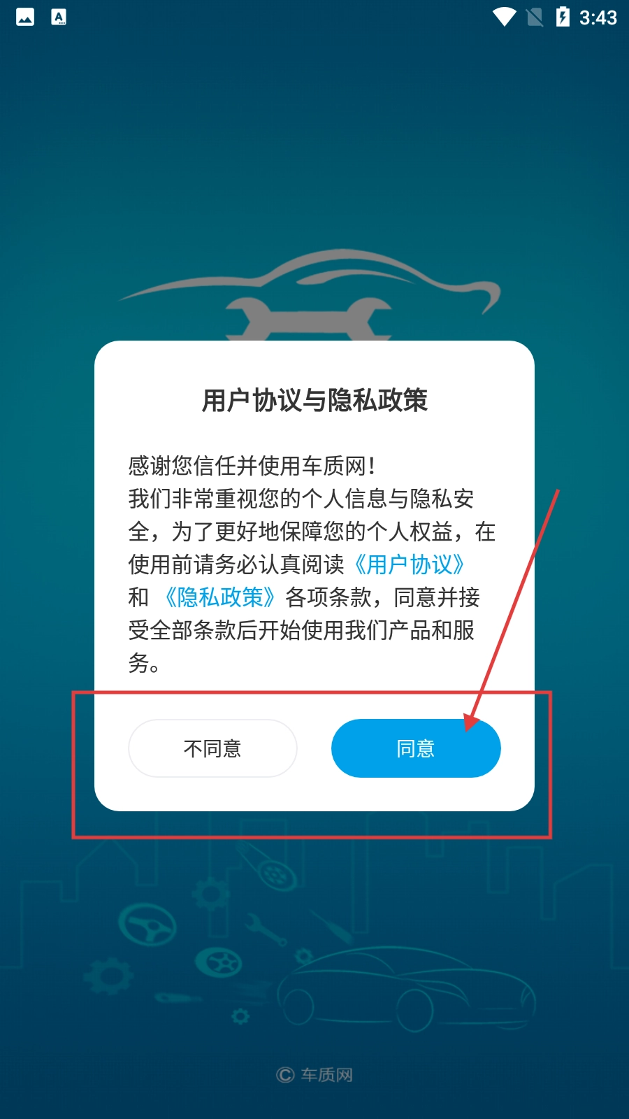 1、在车质网的用户协议与隐私政策弹窗中,点击【同意】按钮,即可进入软件主界面。