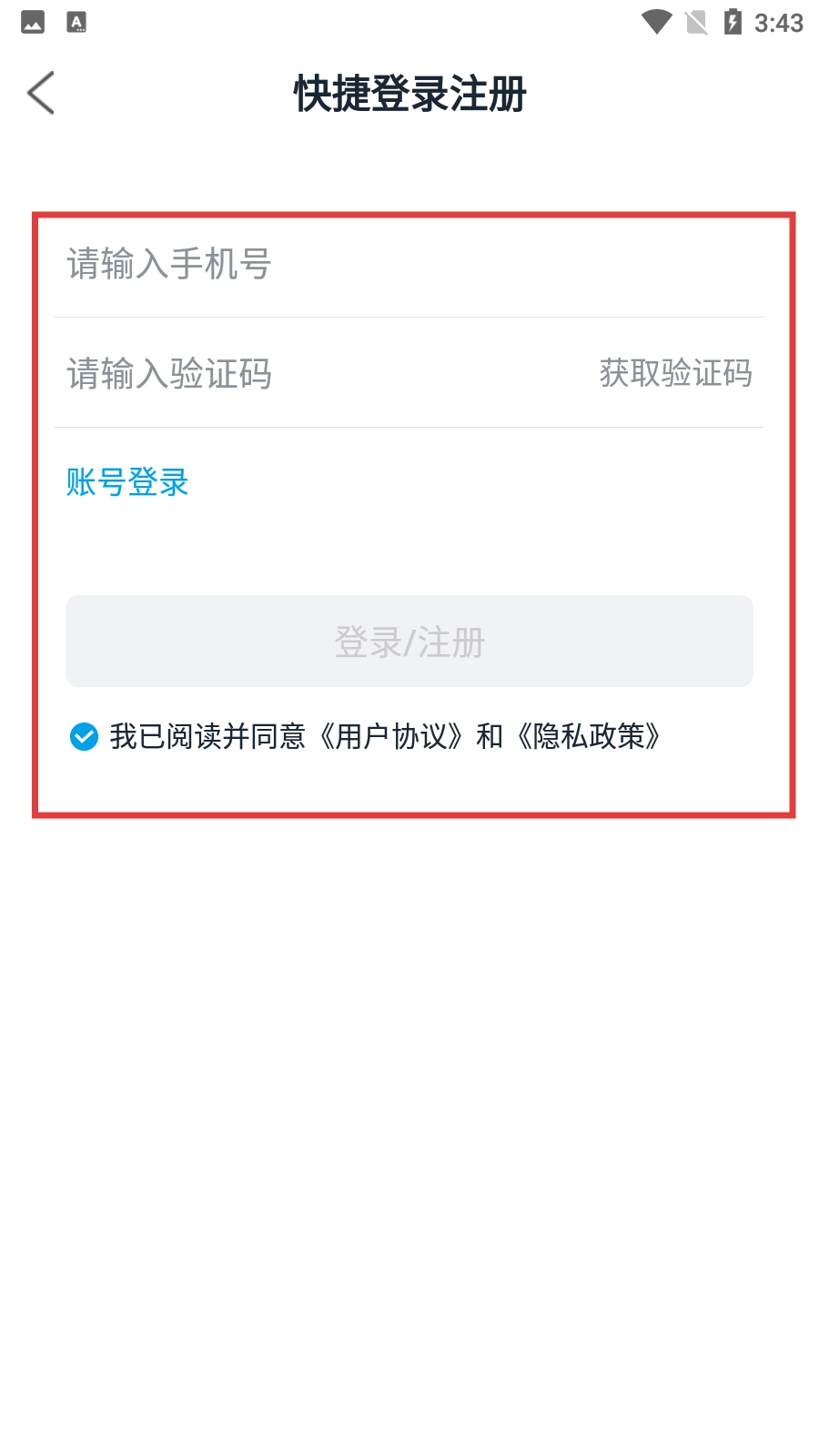 4、在快捷登录注册页面,输入手机号、获取并输入验证码,点击【登录/注册】按钮即可完成账号登录或注册。