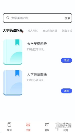 2通过“添加新书”的入口进入精选书库后,能轻松筛选并将CET-4核心词汇教材添加到个人学习列表中。