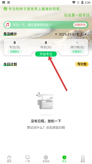 1、点击底部【专注】选项,进入专注功能页面,可开启专注计时功能,助力高效完成学习或工作任务。