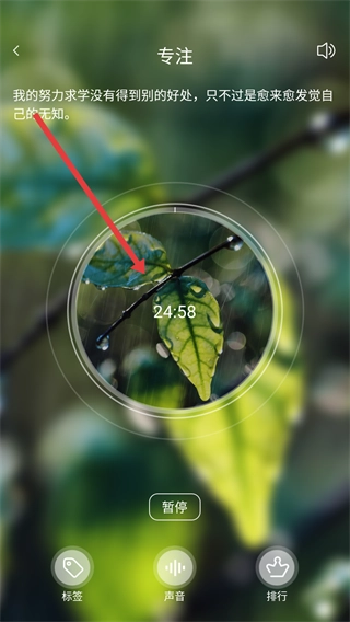 4、专注计时启动后,界面显示剩余时间,若需暂停可点击【暂停】按钮,完成专注后可记录专注成果,积累专注时长。
