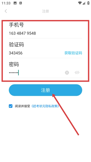 4、在注册页面,填写手机号、验证码和密码后,点击【注册】按钮,完成账号注册操作。