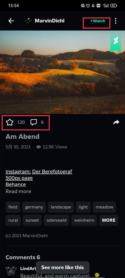 3、登录成功后,你可以收藏并评论自己喜爱的绘画、素描等作品图片,还能点击右上角的“+Watch”按钮进行分类操作,以便更高效地管理这些图片。