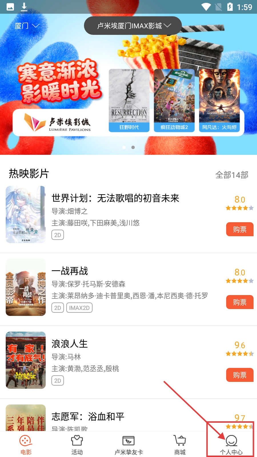 在电影首页,点击右下角的【个人中心】按钮,即可进入个人中心页面。