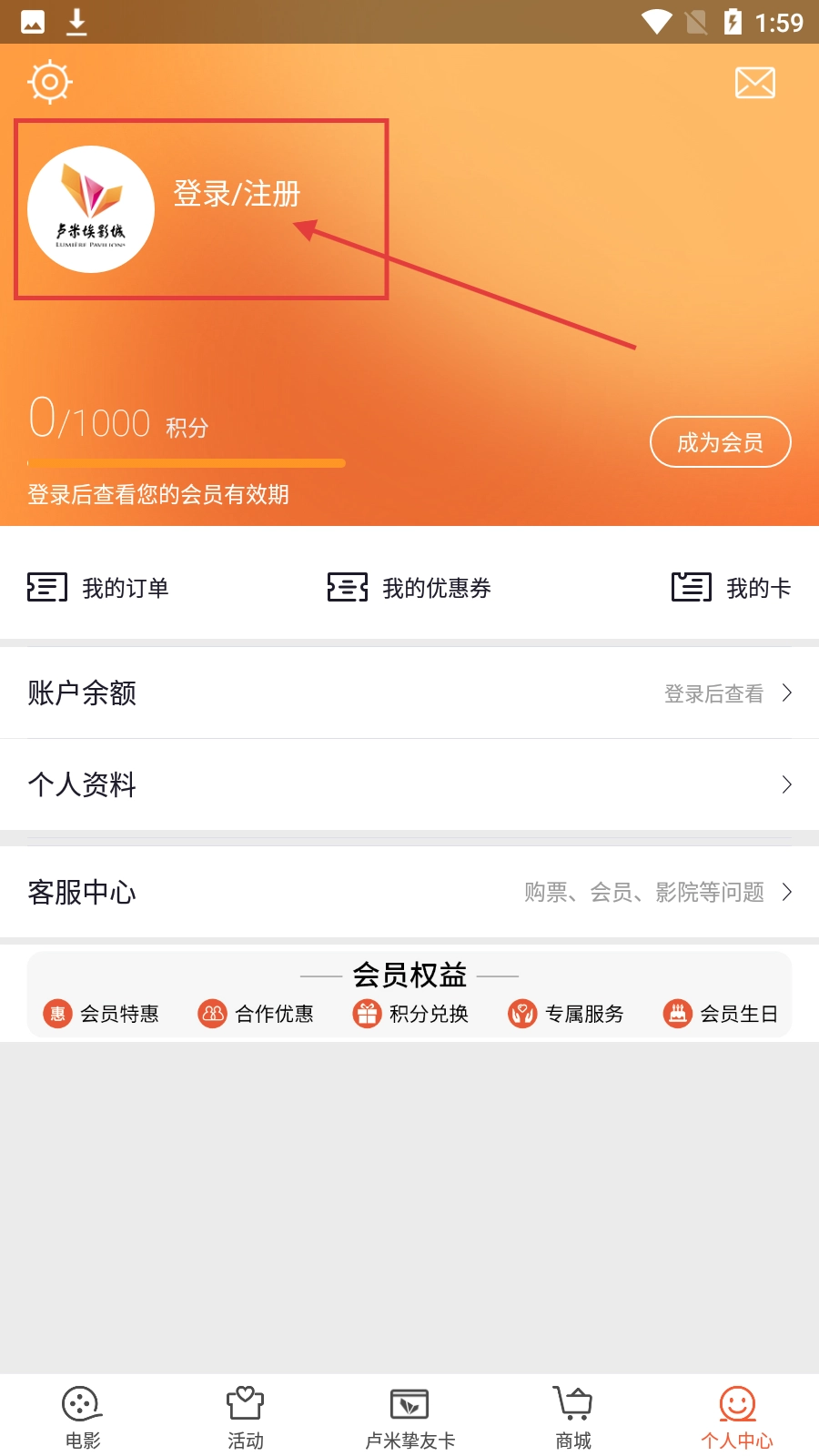 2、进入个人中心页面后,找到【登录/注册】区域并点击,即可进入登录界面。