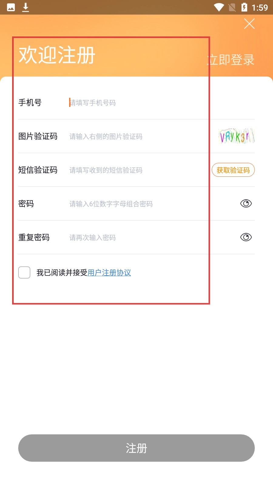 4、进入注册页面后,依次输入手机号、图片验证码和短信验证码,接着设置并确认密码,最后勾选同意相关协议,即可完成注册操作。