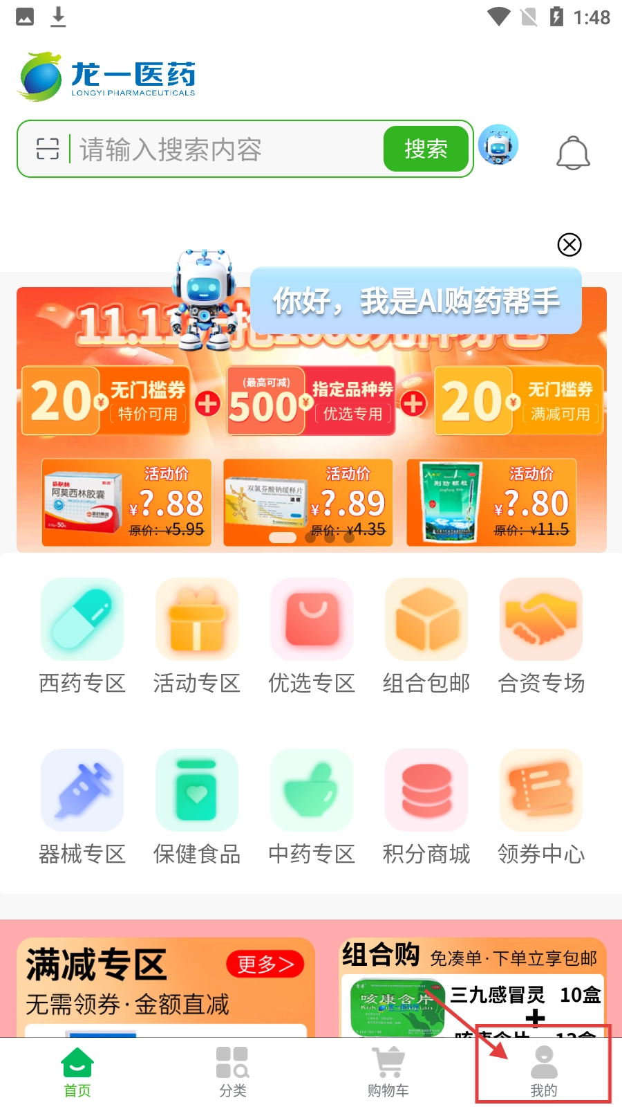 1、打开龙一医药首页后,点击页面右下角的【我的】按钮,即可进入个人中心页面。