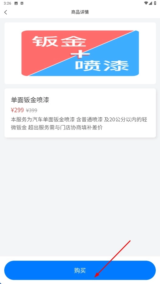 3、在商品详情页,可查看钣金喷漆服务详情,点击【购买-功能按钮】完成购买。