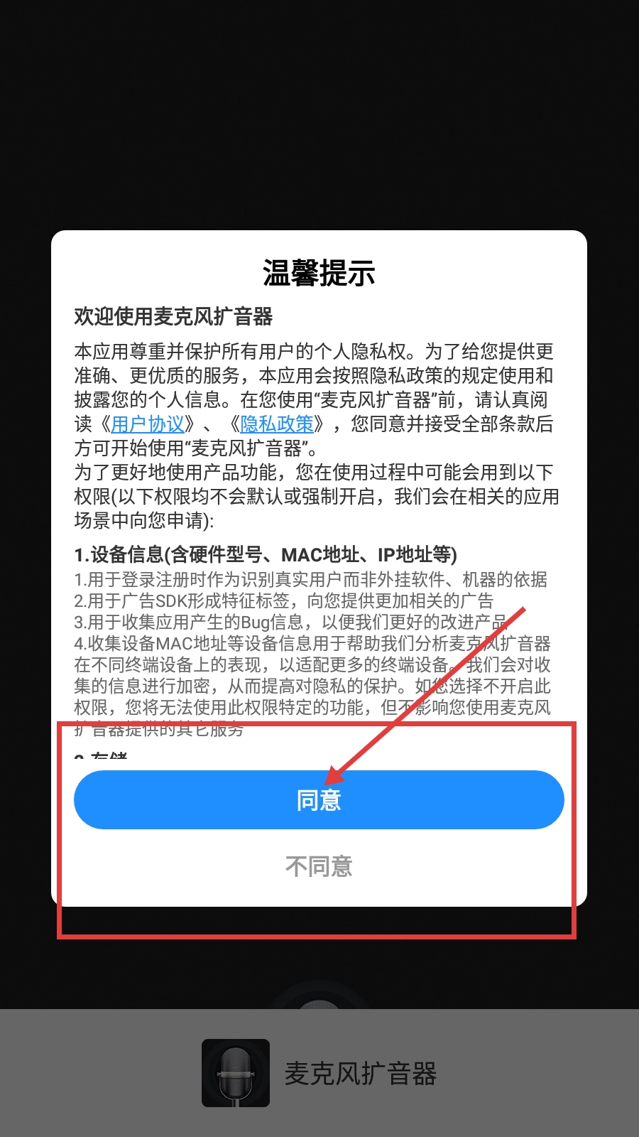 使用【麦克风扩音器】前,请务必阅读《用户协议》和《隐私政策》,点击【同意】按钮后才能进入软件。