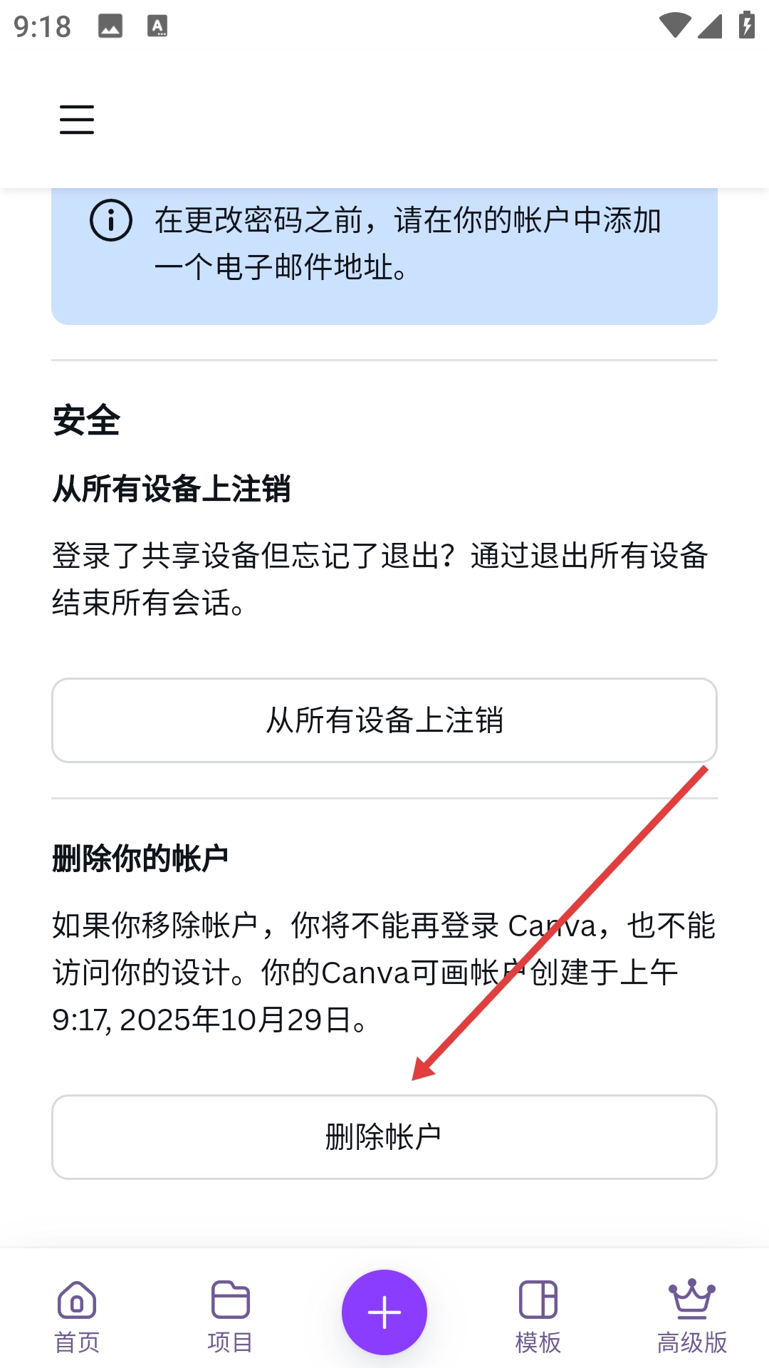 4、进入登录设置页面后,点击【删除帐户】按钮,即可进行账户删除操作。