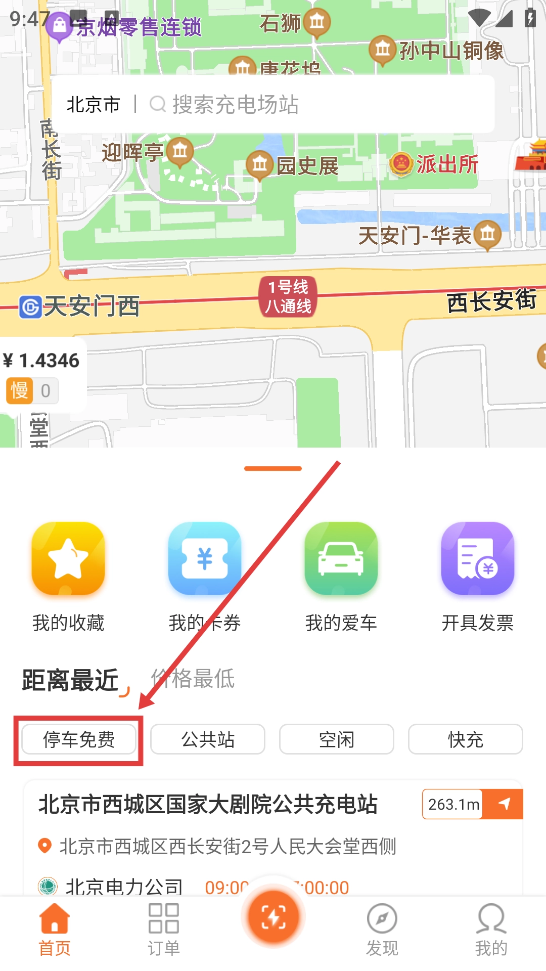 1、在充电首页点击【停车免费】标签,筛选出提供免费停车的充电站。