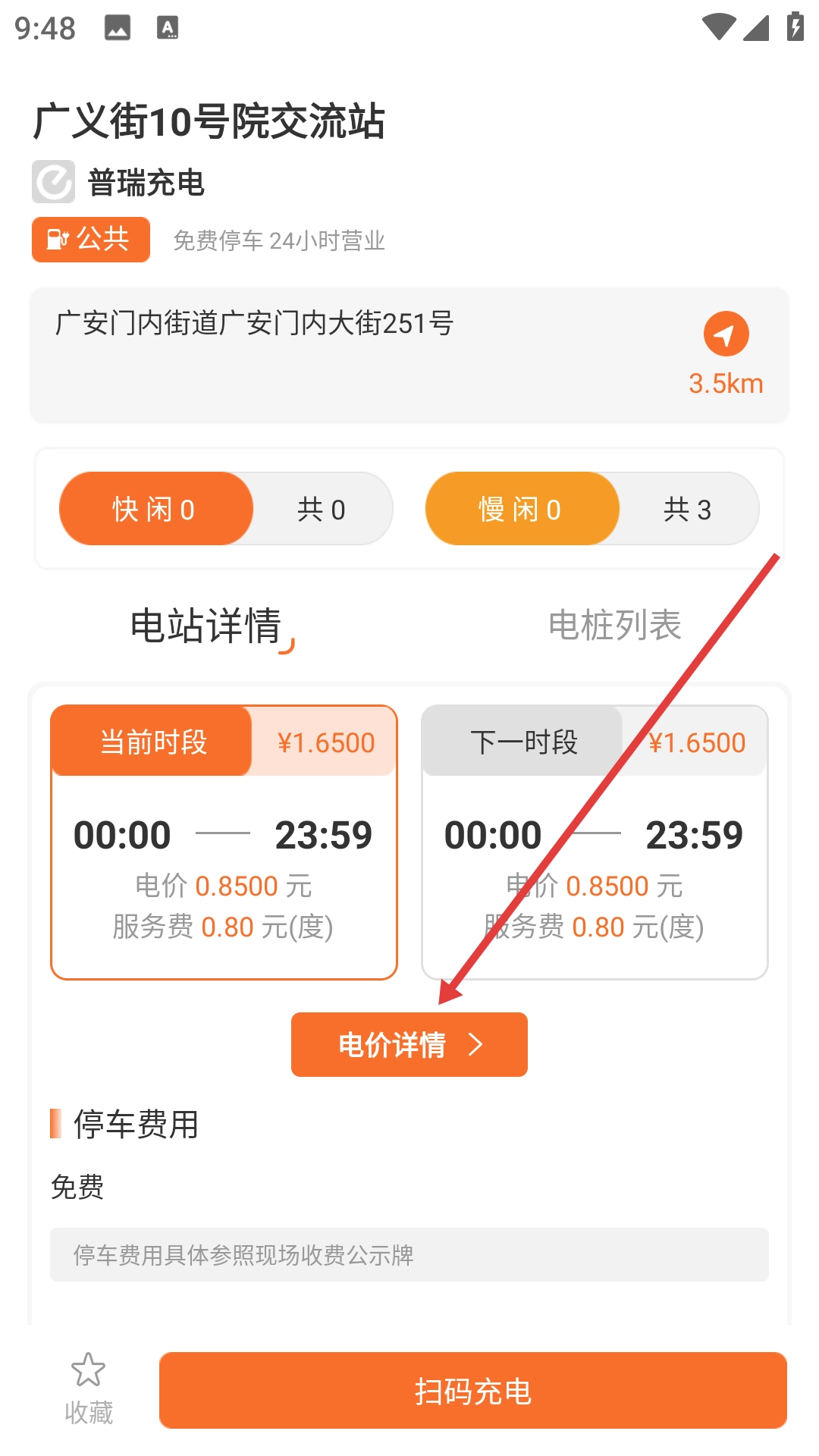 2、在筛选结果中点击目标充电站(如广义街10号院交流站),进入电站详情页面。
