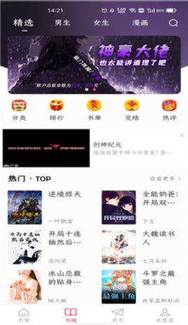 进入软件的书城精选页面后,能看到精选、女生、男生、漫画等分类,此外还有排行、书单、完结以及热评的小说和漫画。