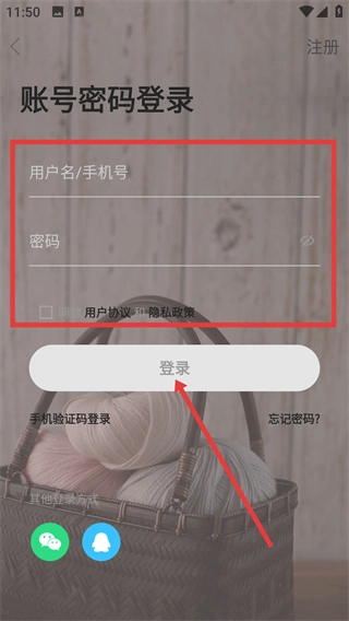 4、进入账号密码登录页面后,填写【用户名/手机号】与【密码】,勾选同意用户协议和隐私政策,再点击【登录】按钮,即可完成登录流程。