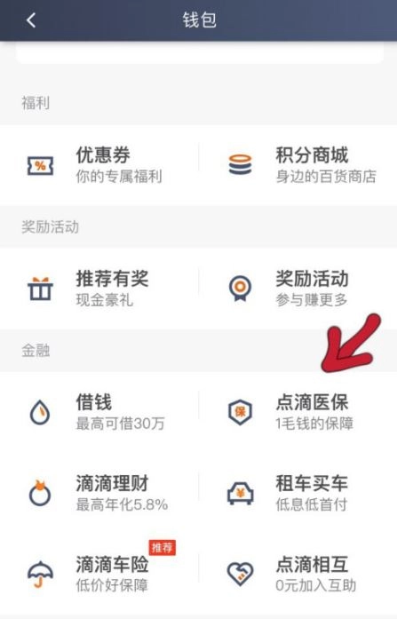 1、进入钱包页面,点击"点滴医保"。