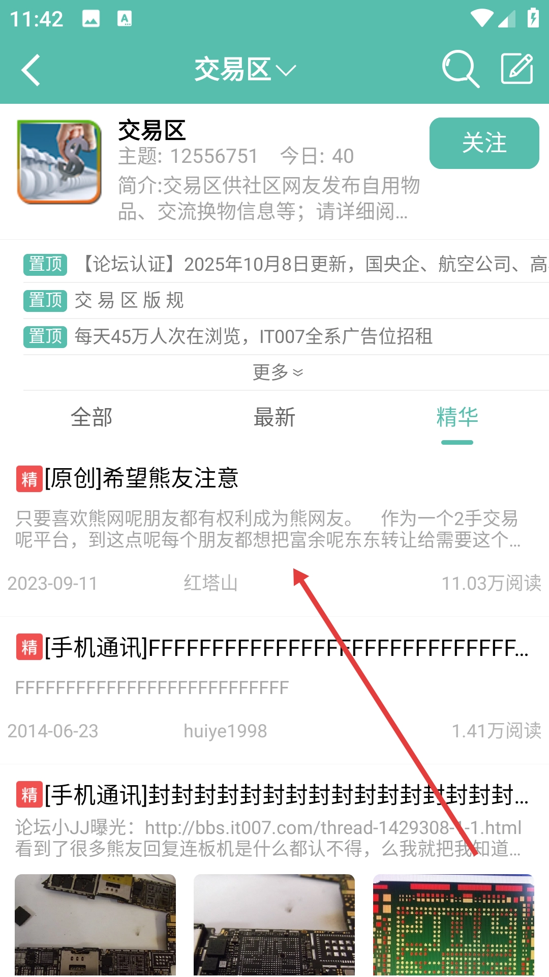 2、在交易区页面点击【精华】标签,切换到精华帖子列表。