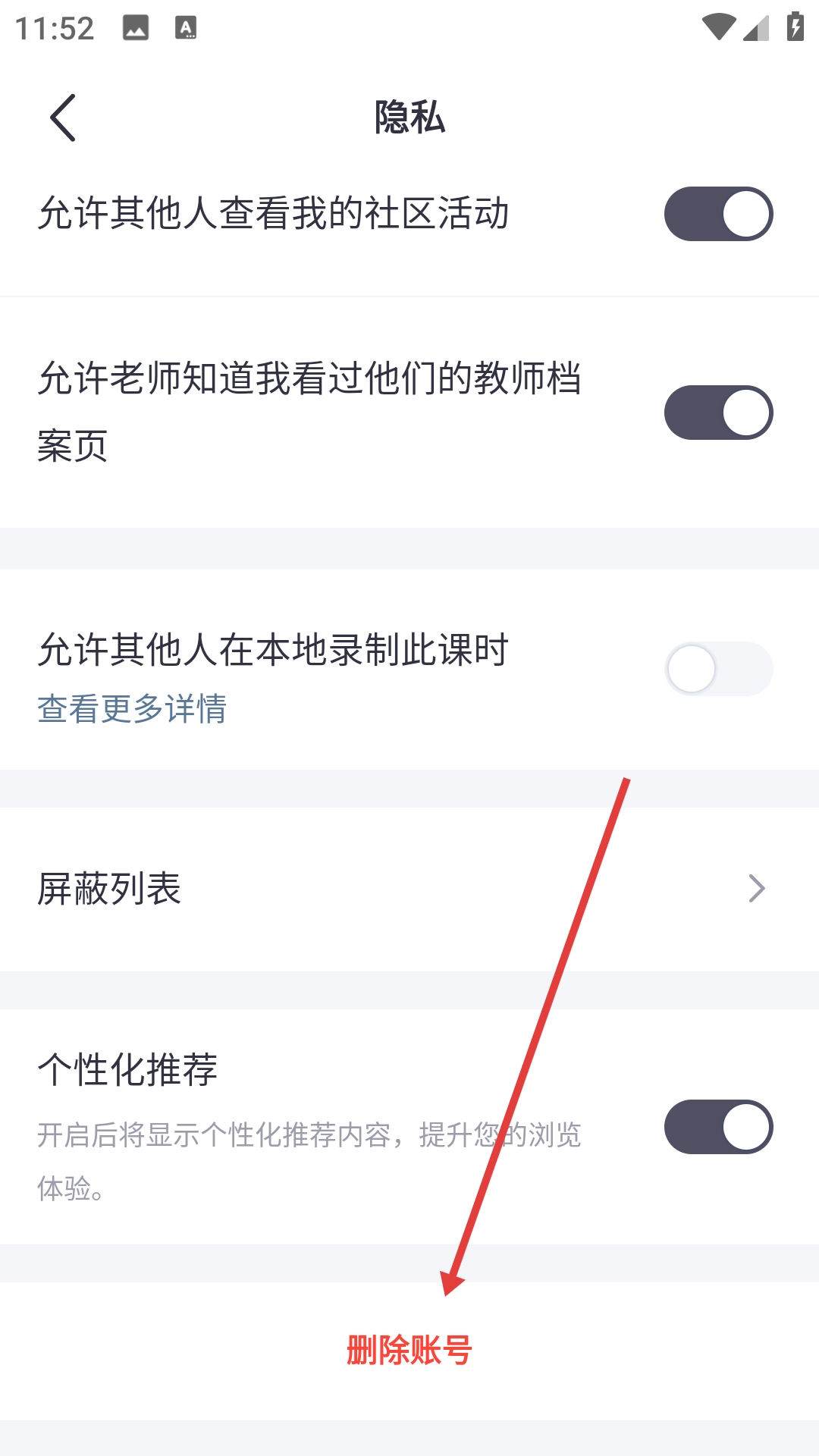 3、在隐私设置界面点击【删除账号】,进入删除账号说明界面。