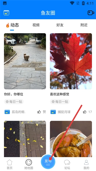 1、进入凤台小鱼网首页,点击底部【鱼友圈】按钮,进入鱼友圈页面,可浏览动态、视频等内容。
