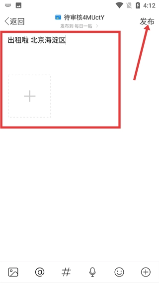 4、在文本编辑页面,输入内容如【出租啦-北京海淀区】,点击右上角【发布】按钮,完成动态发布。
