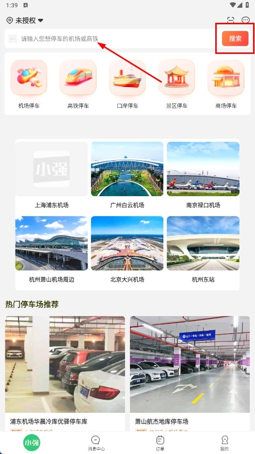 1、在搜索框中输入您计划停车的机场或高铁站名称,点击【搜索】功能按钮,即可查询相关的停车信息。