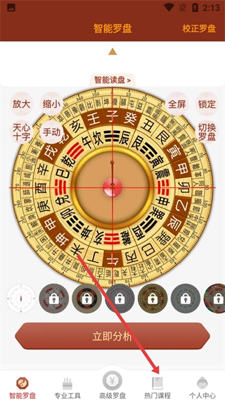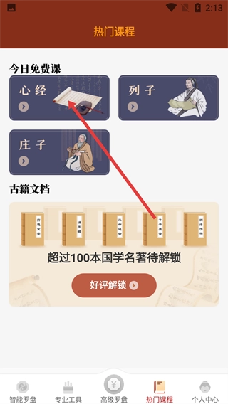 1、在智能罗盘页面,点击底部【热门课程】,该页面还有专业工具、高级罗盘等功能入口,热门课程板块提供国学经典课程与古籍资源。