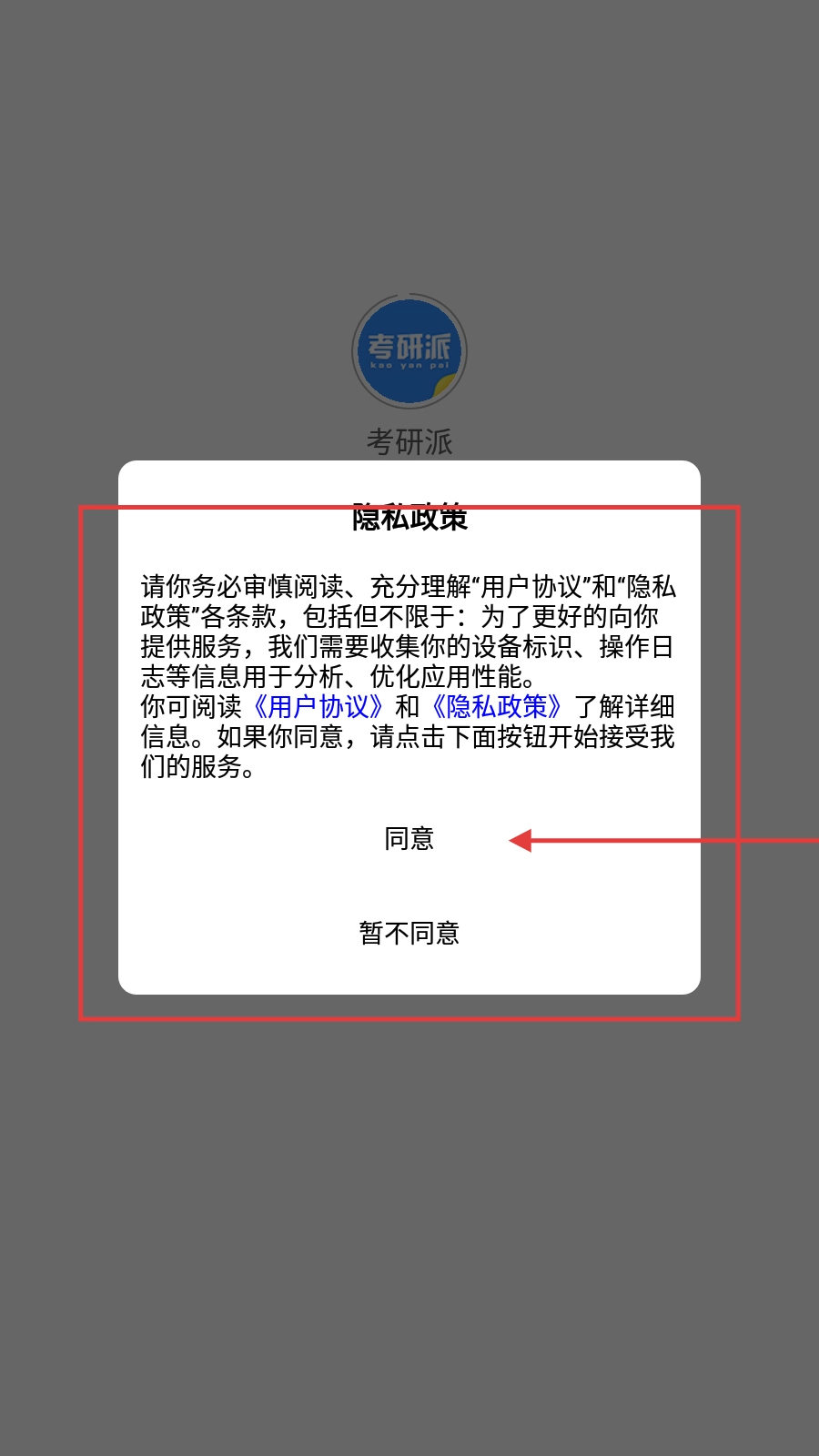 1、进入【考研派】,点击【同意】隐私政策,开始使用服务。