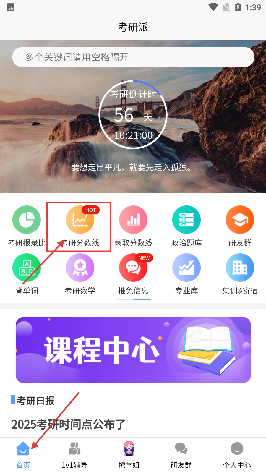 2、在【考研派】首页,点击【考研分数线】,进入历年分数线查询页面。
