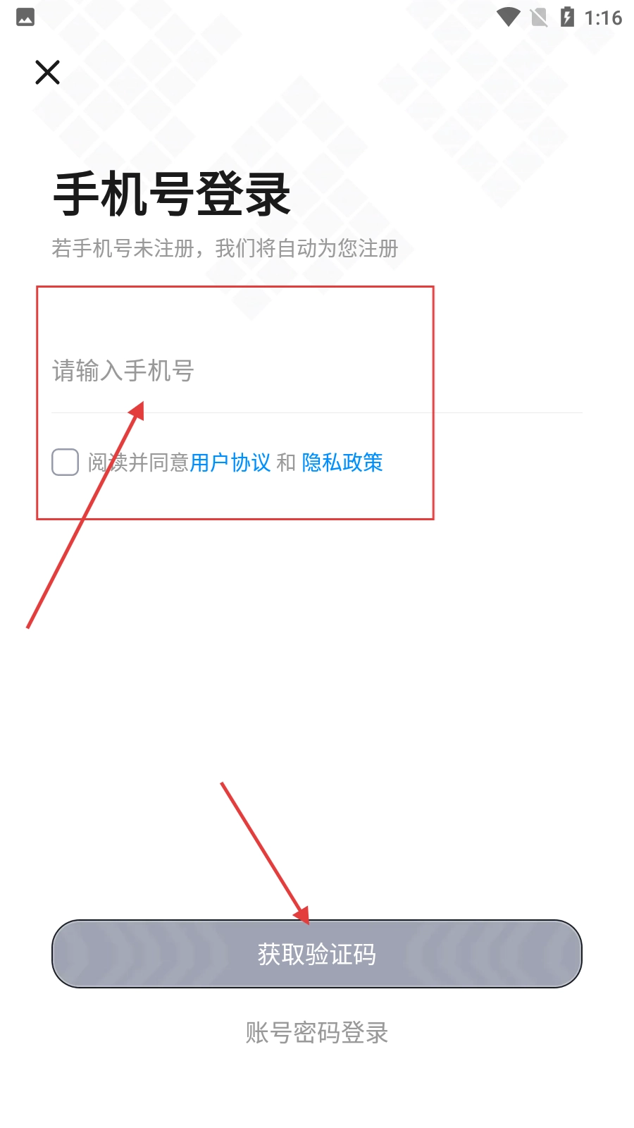 3、进入手机号登录页面后,先输入手机号,接着勾选【阅读并同意用户协议】,再点击【获取验证码】按钮。