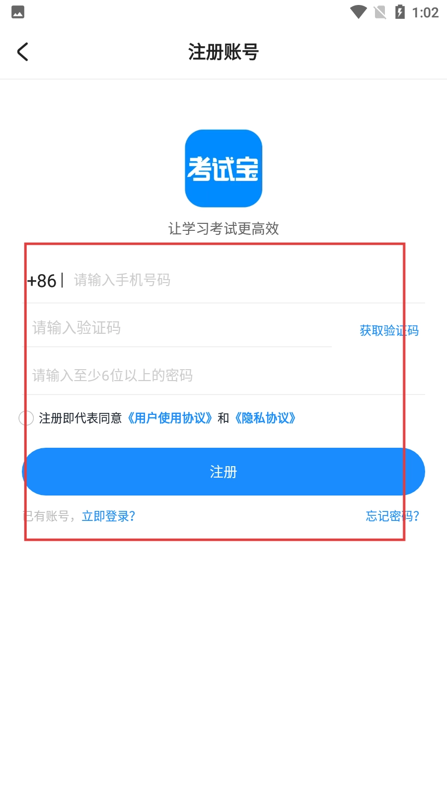 4、进入注册账号页面后,依次填写手机号码、验证码以及不少于6位的密码,勾选相关协议条款,最后点击【注册】按钮,即可完成账号注册流程。