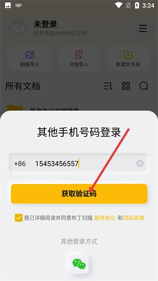 3、在登录窗口中,输入手机号码后,点击【获取验证码】按钮,等待验证码发送。