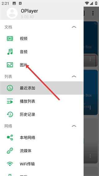 1、进入OPlayer的【最近添加】页面后,点击左上角【三】形菜单按钮,展开功能列表。