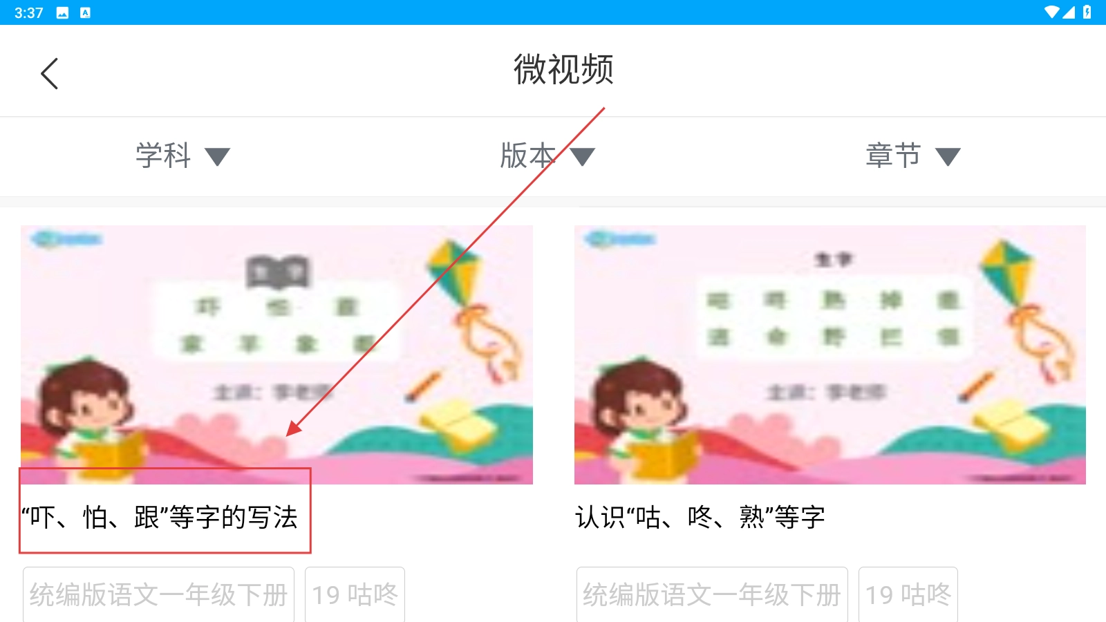 3、在视频列表中,找到并点击标题为【“吓、怕、跟”等字的写法】的视频,即可观看该微视频。