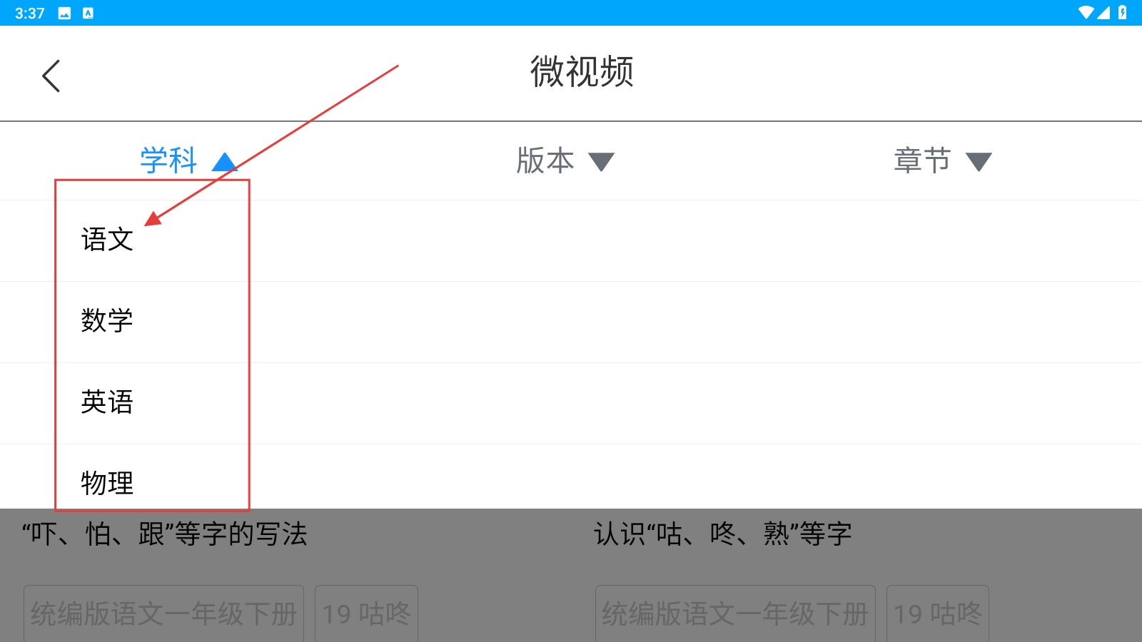 2、进入微视频页面后,点击【语文-学科分类】选项,即可筛选出对应学科的视频资源。