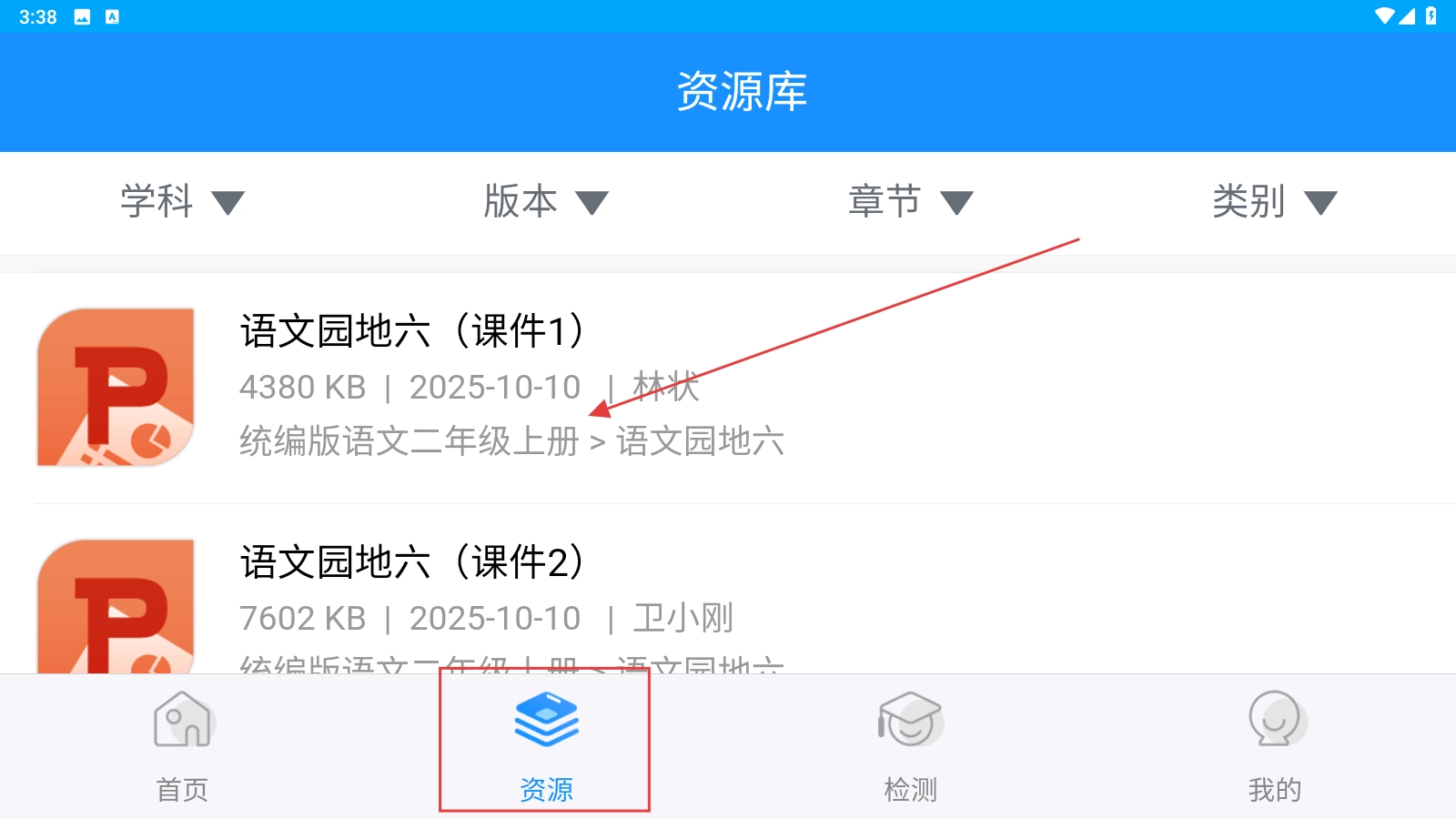 4、点击底部的【资源】功能按钮,进入资源库页面后,就能查看像【语文园地六(课件1)-课件资源】这类内容了。