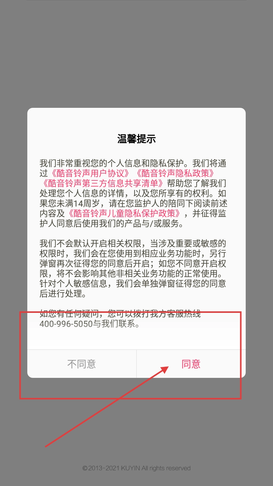1、打开酷音铃声应用,在弹出的【温馨提示】窗口中点击【同意】按钮,即可进入软件的首页界面。