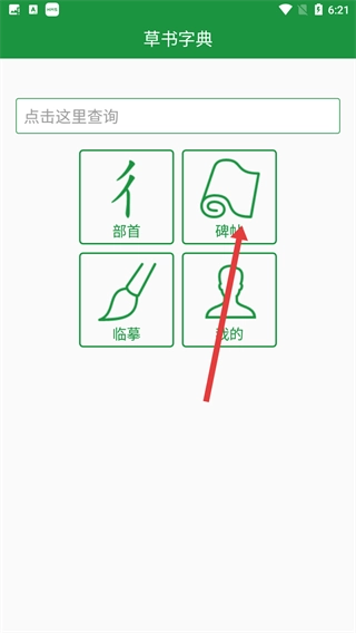 1、在草书字典的主界面上,找到并点击【碑帖】选项,即可进入碑帖列表界面,在该界面中能够查看各类草书碑帖相关资源。