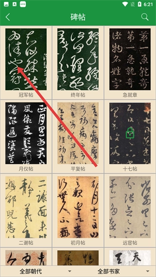 2、在碑帖列表界面中,点击【冠军帖】这一选项,即可进入该碑帖对应的详情页面。