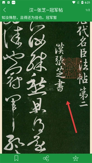 4、进入汉·张芝《冠军帖》的内容界面后,就能浏览此碑帖的草书文字及相关信息,开展书法鉴赏与学习活动。