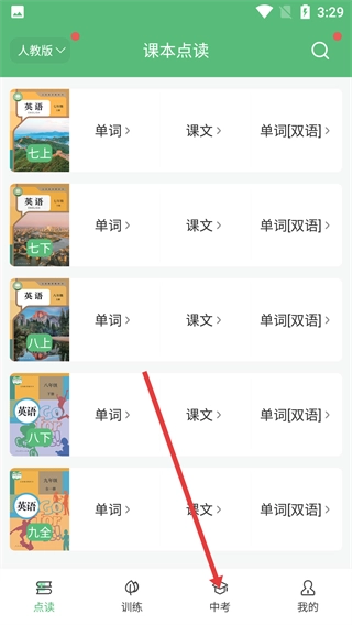 1、在课本点读页面底部点击【中考】,进入中考板块页面,可查看中考英语相关学习资源。
