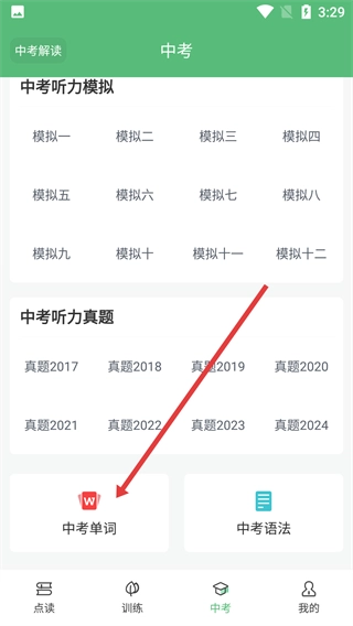 2、在中考板块页面点击【中考单词】,进入中考单词分类页面,可选择不同范围的单词进行学习。