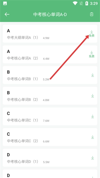 3、在中考单词分类页面点击【中考核心单词A-D】,进入该范围单词列表页面。