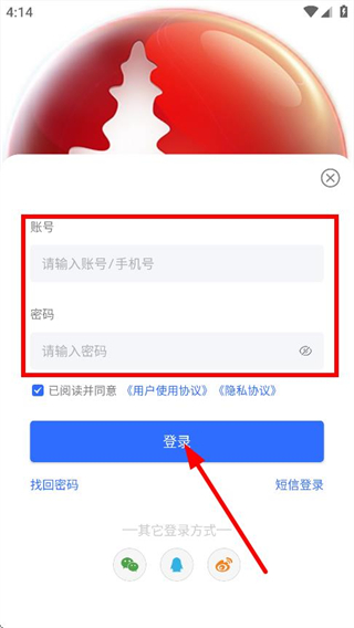 4、在登录界面,输入账号和密码后点击登录按钮,即可完成账号的登录操作。