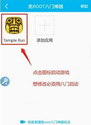 2、添加游戏“神庙逃亡”之后,点击图标启动游戏。记住,一定要在八门内使用启动才能生效。