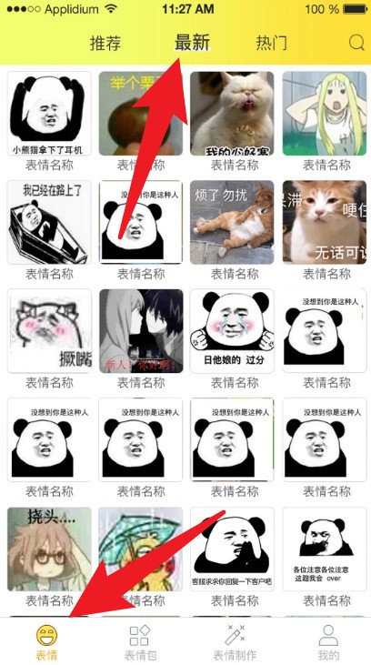 1打开应用后会自动停留在表情相关的页面,在这里可以通过滑动操作查看推荐、最新和热门分类下的各类热门表情图片。